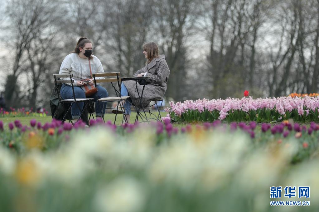4月14日,參觀者坐在比利時(shí)布魯塞爾以西的拜加登城堡的鮮花旁休息聊天。
