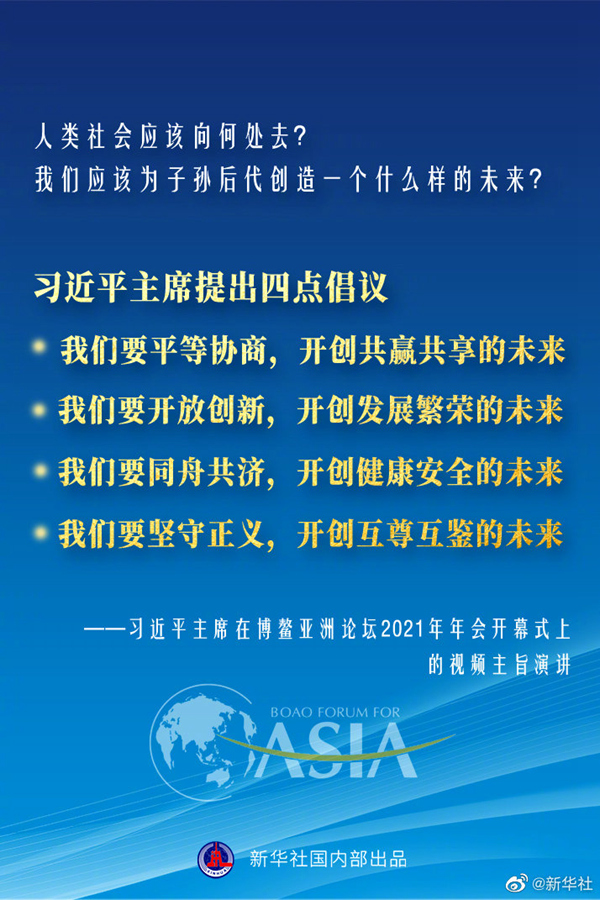 博鰲亞洲論壇2021年年會(huì)開(kāi)幕式20日上午在海南博鰲舉行,國(guó)家主席習(xí)近平以視頻方式發(fā)表主旨演講。面對(duì)“人類社會(huì)應(yīng)該向何處去?我們應(yīng)該為子孫后代創(chuàng)造一個(gè)什么樣的未來(lái)?”這一重大命題,習(xí)近平主席提出四點(diǎn)倡議。