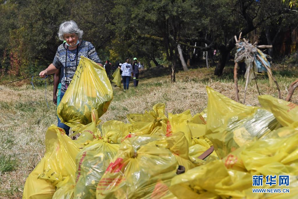 4月22日,南非比勒陀利亞的志愿者將收集好的垃圾放到指定區(qū)域。