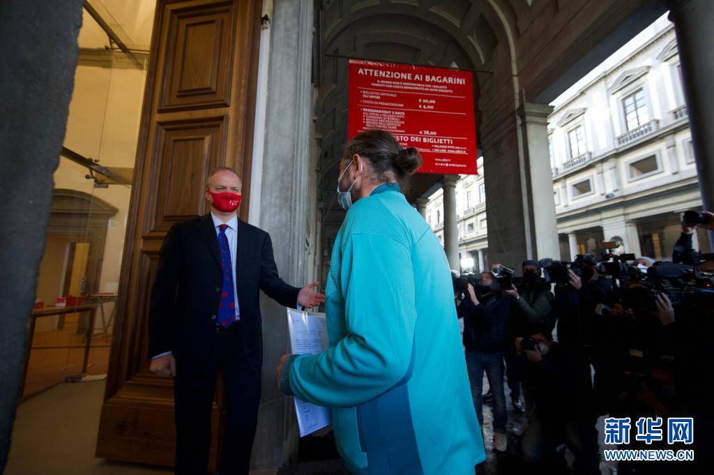 5月4日,在意大利佛羅倫薩,烏菲齊美術(shù)館館長施密特(左)在重新開放的美術(shù)館門口迎接參觀者。當(dāng)日,意大利烏菲齊美術(shù)館重新開放。美術(shù)館改建了售票處和接待處,以避免排隊(duì),并開設(shè)了十四個新展室。新華社發(fā)