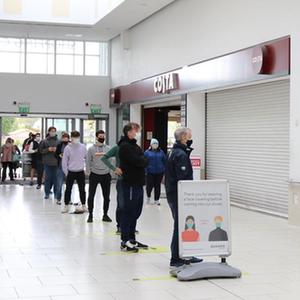 5月10日,人們?cè)趷?ài)爾蘭首都都柏林一家重新恢復(fù)營(yíng)業(yè)的理發(fā)館外排隊(duì)。