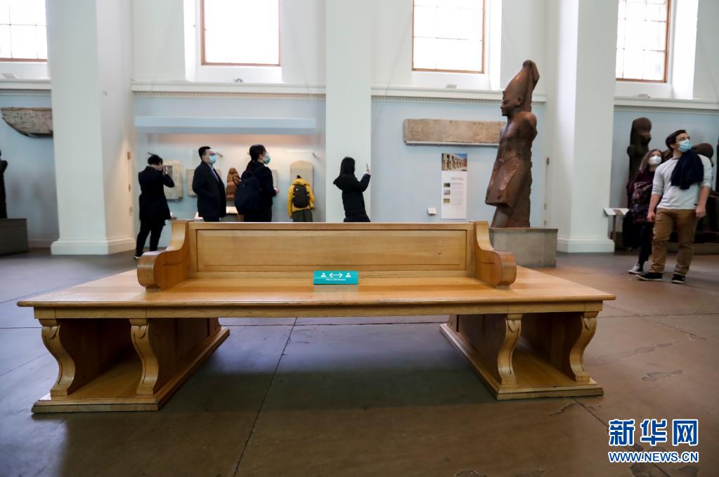 5月17日,在英國倫敦的大英博物館,座椅上放置著提醒參觀者保持安全距離的提示牌。新華社記者 韓巖 攝
