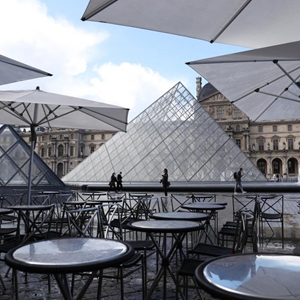 5月19日,法國巴黎盧浮宮博物館旁的餐館戶外區(qū)域準(zhǔn)備迎客。