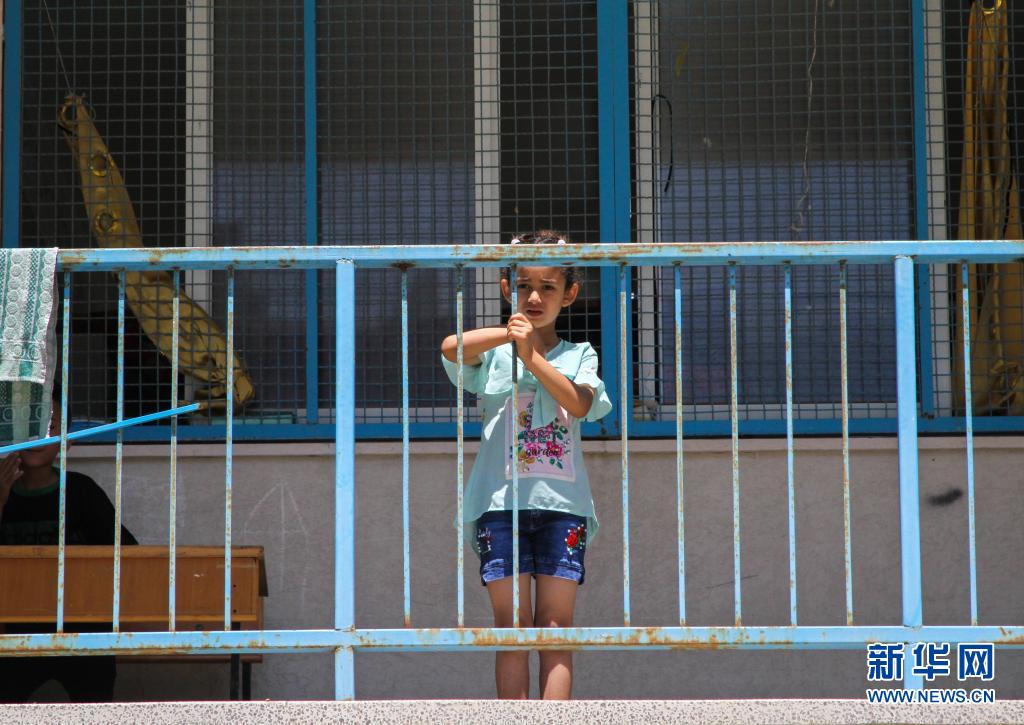 5月19日,受空襲影響而逃離家園的7歲巴勒斯坦兒童拉米·蘇丹在加沙城的一所學(xué)校臨時(shí)棲身。
