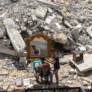 5月26日,在加沙地帶北部的城鎮(zhèn)貝特拉希亞,23歲的巴勒斯坦理發(fā)師阿卜杜拉·扎瓦拉在他被以色列炸毀的房屋前為顧客免費(fèi)服務(wù)。 新華社發(fā)(里澤克·阿卜杜勒·賈瓦德攝)