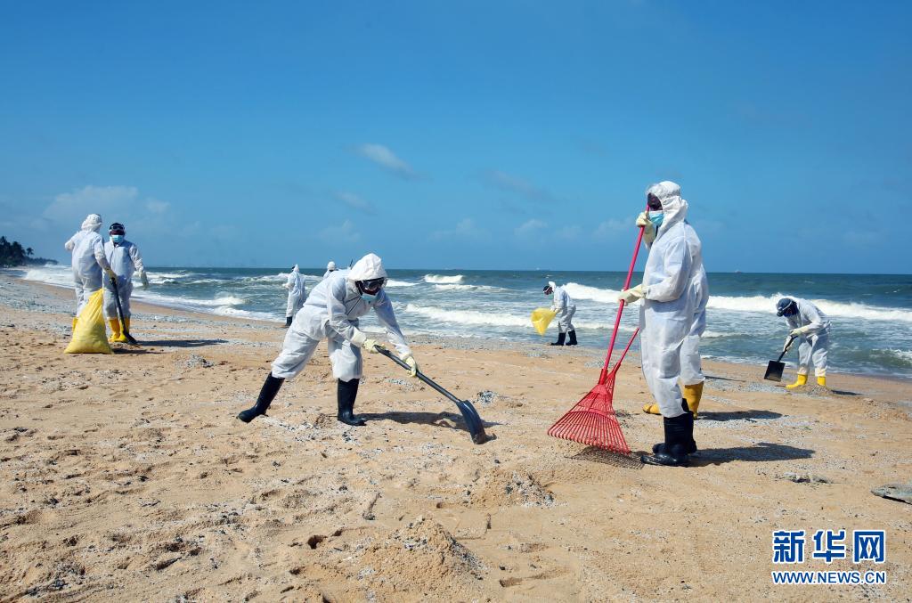6月2日,工作人員在斯里蘭卡科倫坡一處沙灘清理貨船燃燒產(chǎn)生的廢物。