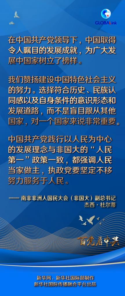杜爾蒂說,2021年是中國共產(chǎn)黨成立一百周年,中國共產(chǎn)黨創(chuàng)造了一個又一個輝煌?!拔抑?jǐn)代表非國大全國執(zhí)行委員會祝賀中國共產(chǎn)黨走過成功的百年。預(yù)祝中國共產(chǎn)黨在下一個百年中取得更大成就!”