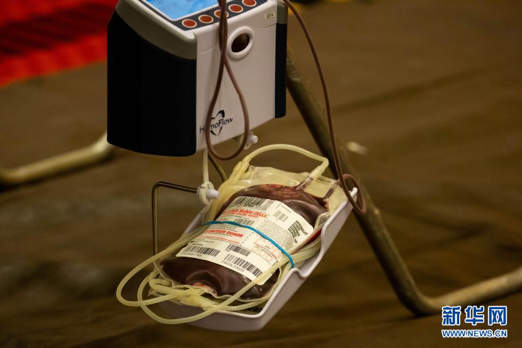 這是6月14日在美國紐約州長島地區(qū)的尤寧代爾拍攝的獻(xiàn)血志愿者在美國紐約血液中心舉行的獻(xiàn)血活動上捐獻(xiàn)的血液。