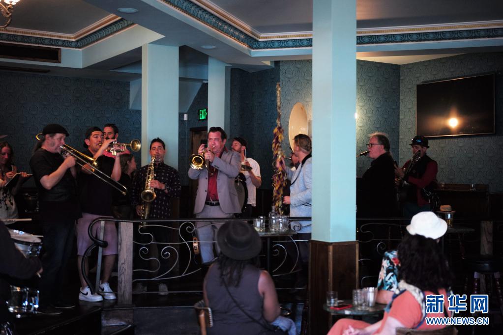 6月15日,一支樂隊(duì)在美國(guó)加利福尼亞州舊金山的一家酒吧內(nèi)演奏。